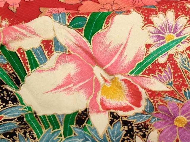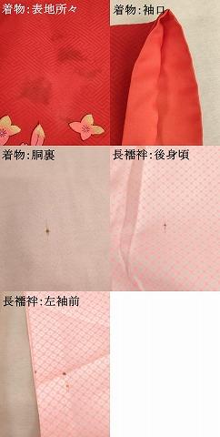 着物【正絹】の状態は接写画像のように表地所々・胴裏に汚れ、袖口に薄い汚れがございます。