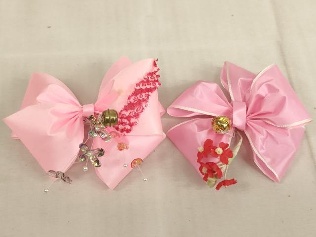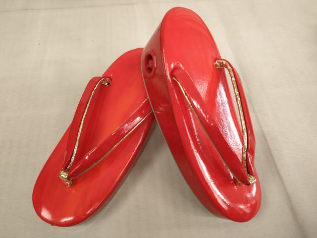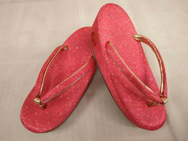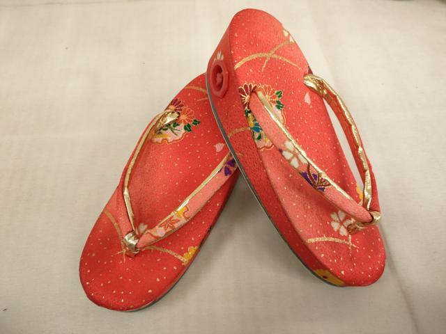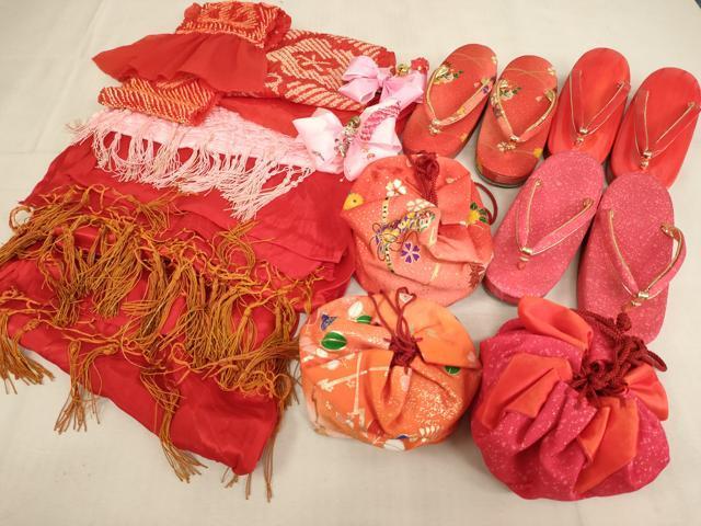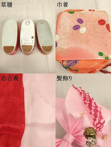 小物の状態は接写画像のように草履・巾着・髪飾りに汚れ、志古貴に薄い汚れ・ペン書きがございますが