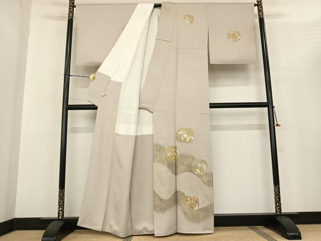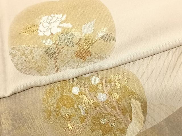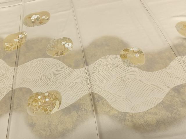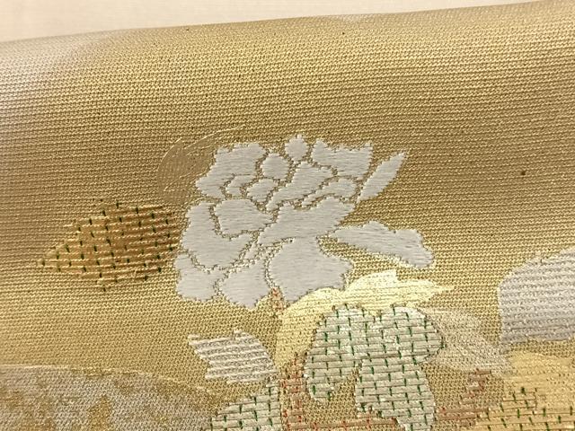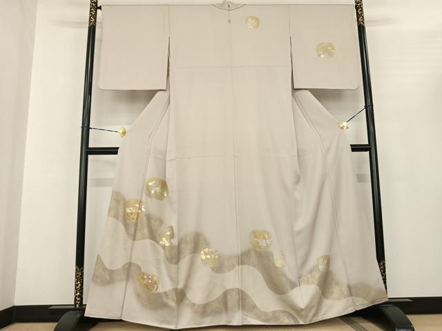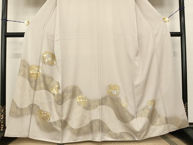 Heiwaya Kimono: Visiting Kimono, Embroidered with Floral and Plant Patterns, Gold-Tone Silk, Excellent Quality, AABF0539fy