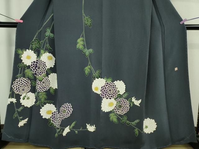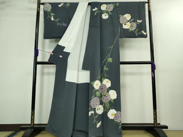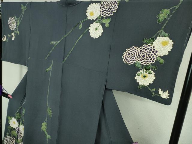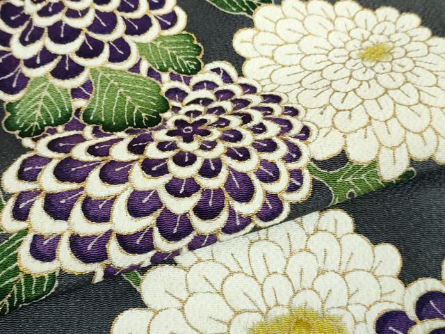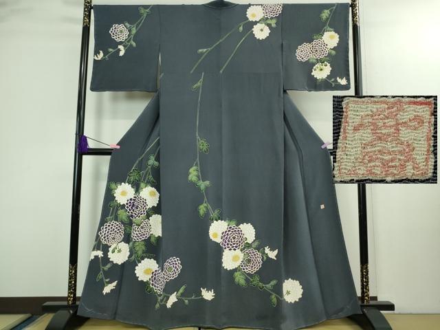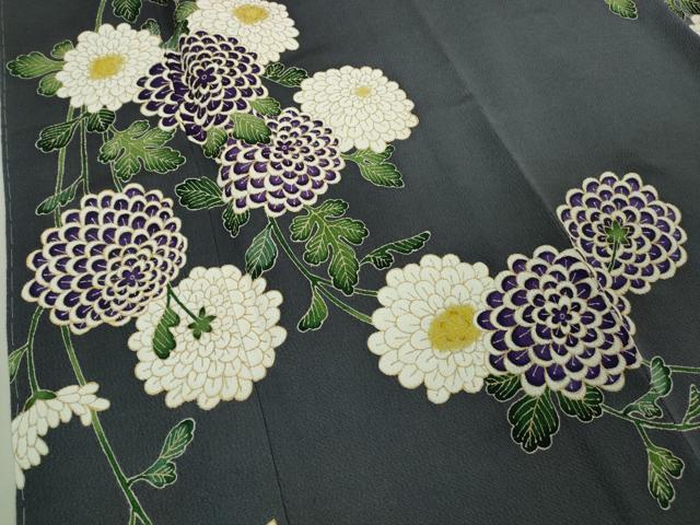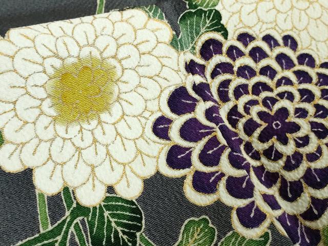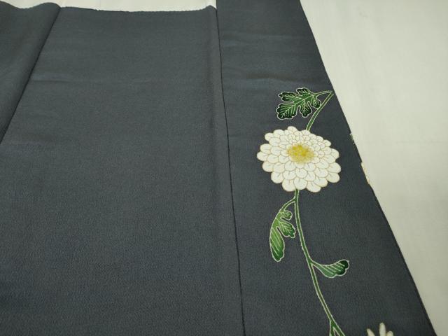 Heiwaya Main Store: Extremely rare Tokyo Yuzen kimono by Akiyoshi Kuroda, featuring a chrysanthemum design on a brown background with gold accents and a textured silk crepe. Unused, excellent condition. Product code: DZAB3073kh6