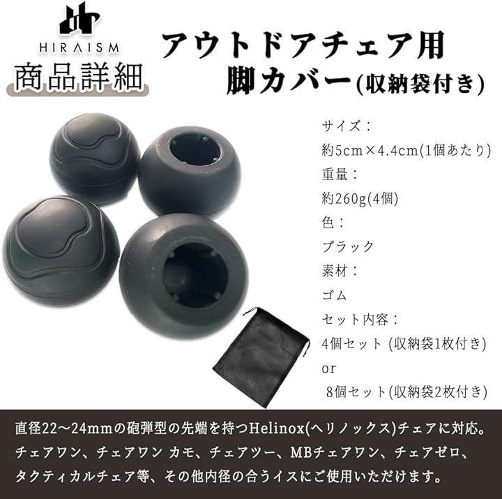 「商品内容」アウトドアチェア用脚カバー <サイズ>5cmx4.4cm <重量>約260g(4個) <色>ブラック <素材>ゴム <セット内容>4個セット or 8個セット <備考>直径22~24mmの砲弾型の先端を持つHelinox(ヘリノックス)チェアに対応。