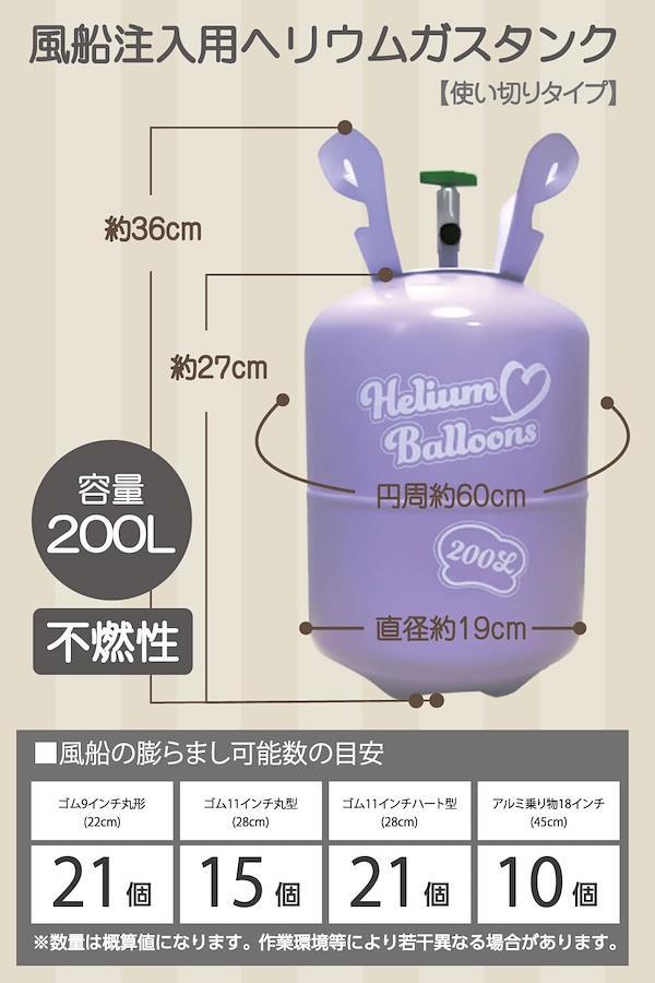 【いろいろなシーンで活躍!】各種イベントで大活躍するヘリウムガス。パーティー、誕生日会、クリスマス、ハロウィン、などの各種イベントやちょっとした業務用としてもお使いいただけます。【タンクの大きさ】直径約19cm、高さ27cm(取っ手含む高さ36cm) / 【内容量】200L【ご注意?】この製品は使い切り用です。ガスやその他のものを充填することは絶対にしないでください。【ご注意?】ヘリウムガスは無害ですが、吸い込むと酸欠になることがあります。絶対に吸い込まないでください。【ガスが入っていなかった場合】弊社にて充填後の全量検品を実施しておりますが、極稀にヘリウムが入っていない事例が報告されています。そのため商品到着後、大事なイベント前には必ず事前にガス充填のご確認をお願いいたします。万が一ヘリウムガスが入っていなかった場合は、大至急代替品を発送いたしますので、弊社にご連絡いただきますようお願い申し上げます。【免責事項】メーカーによる商品リニューアルに伴いパッケージ(内容量も含む)変更が行われた場合、新パッケージでお届け致します事ご了承願います。