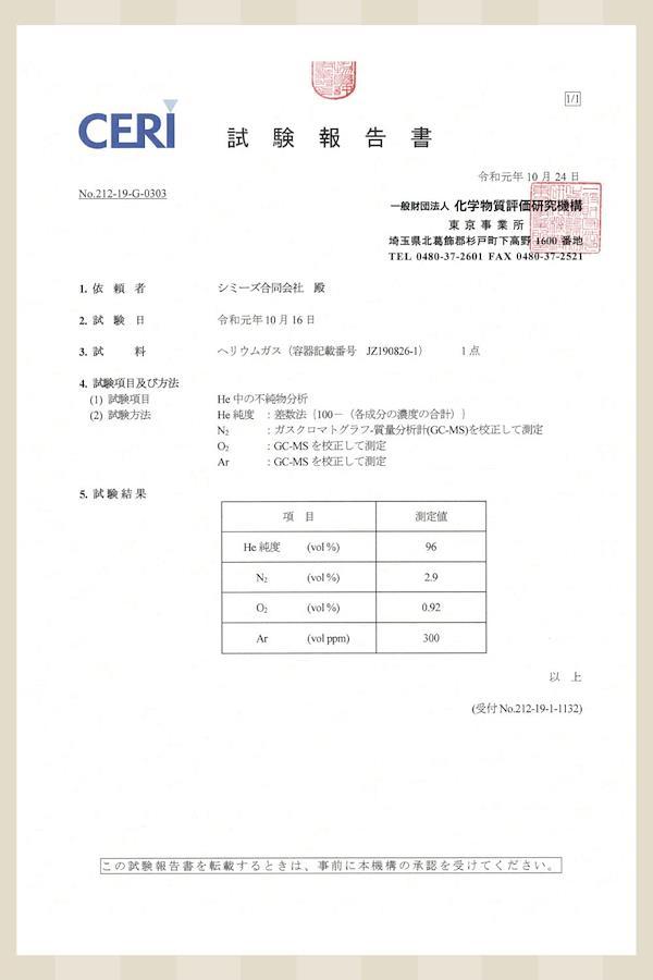 ー注意事項ー ●ゴム風船での注意 ・ゴム風船の平均浮遊時間は約5時間~10時間なので、イベント前日に膨らませていると萎んでしまう可能性があります。必ずイベントの当日に封入するようにしてください。 ・バルーン装飾がはじめての場合、当日予想以上に時間がかかることを想定し、事前に一度試しに膨らませてみることをお勧めいたします。 ●文字風船での注意 ・文字風船などの風船の内容積が小さい風船はヘリウムガスを多く封入できないため、浮かすことができません。 ●その他注意事項 ・ヘリウムガスは無害ですが、吸い込むと酸欠になることがあります。絶対に吸い込まないでください。 ・この製品は使い切り用です。ガスやその他のものを充填することは絶対にしないでください。 ・ガスを一度に使いきらない場合は、元栓(緑色)をしっかり締めてください。元栓を開けたままにしておくと徐々にガスが抜けてしまいます。 ・ヘリウムガスは不燃性ですが、本製品を自動車の車内や、火気使用場所など高温(40℃以上)になる場所には絶対に置かないでください。破裂する危険があります。 ・本製品にサビがでている場合はご使用しないでください。 ・直射日光の当たる場所に置かないでください。破裂する危険があります。 ・本製品をを落としたり、転がしたり、投げたりなど、乱暴な扱いはしないでください。破損の原因になります。 ・お子様の手の届くところに絶対に置かないでください。思わぬ事故を起こす可能性があります。