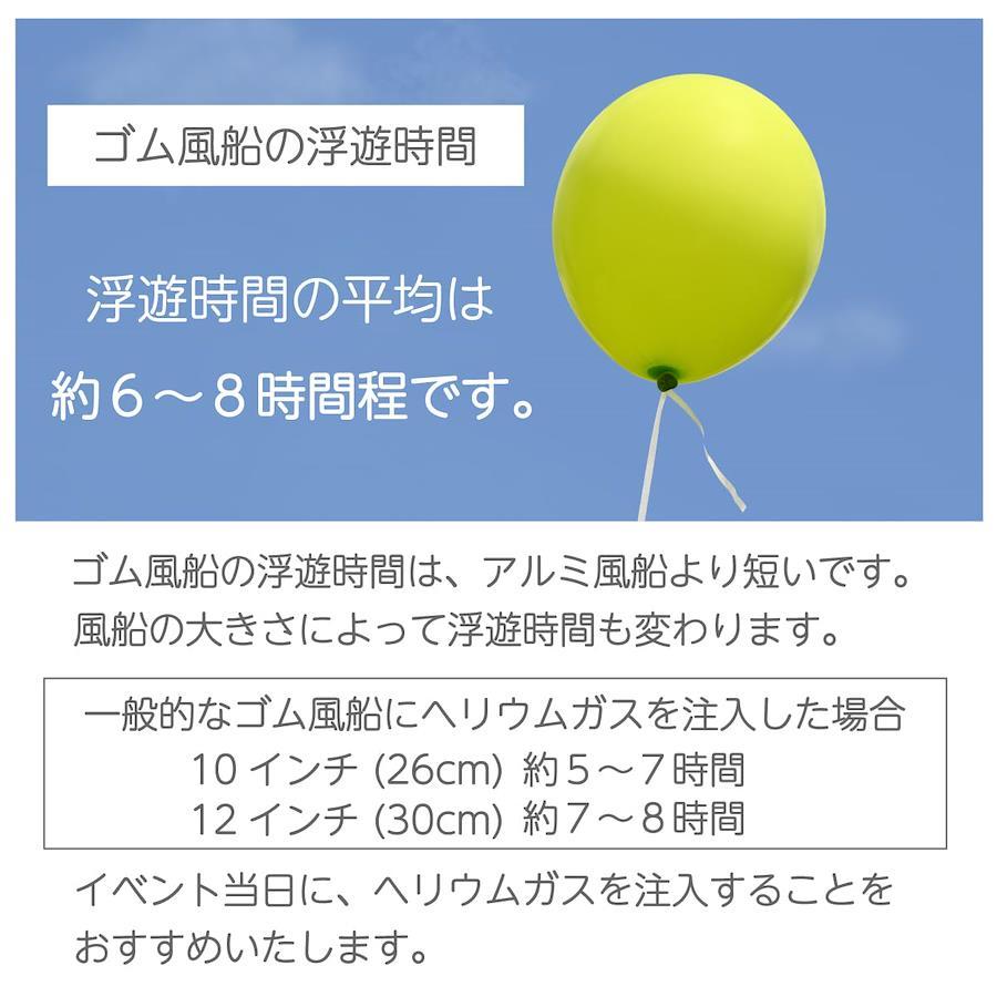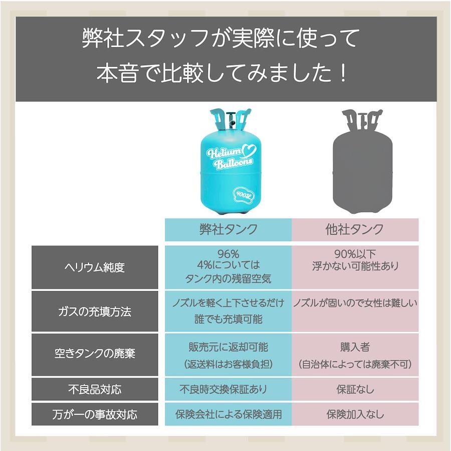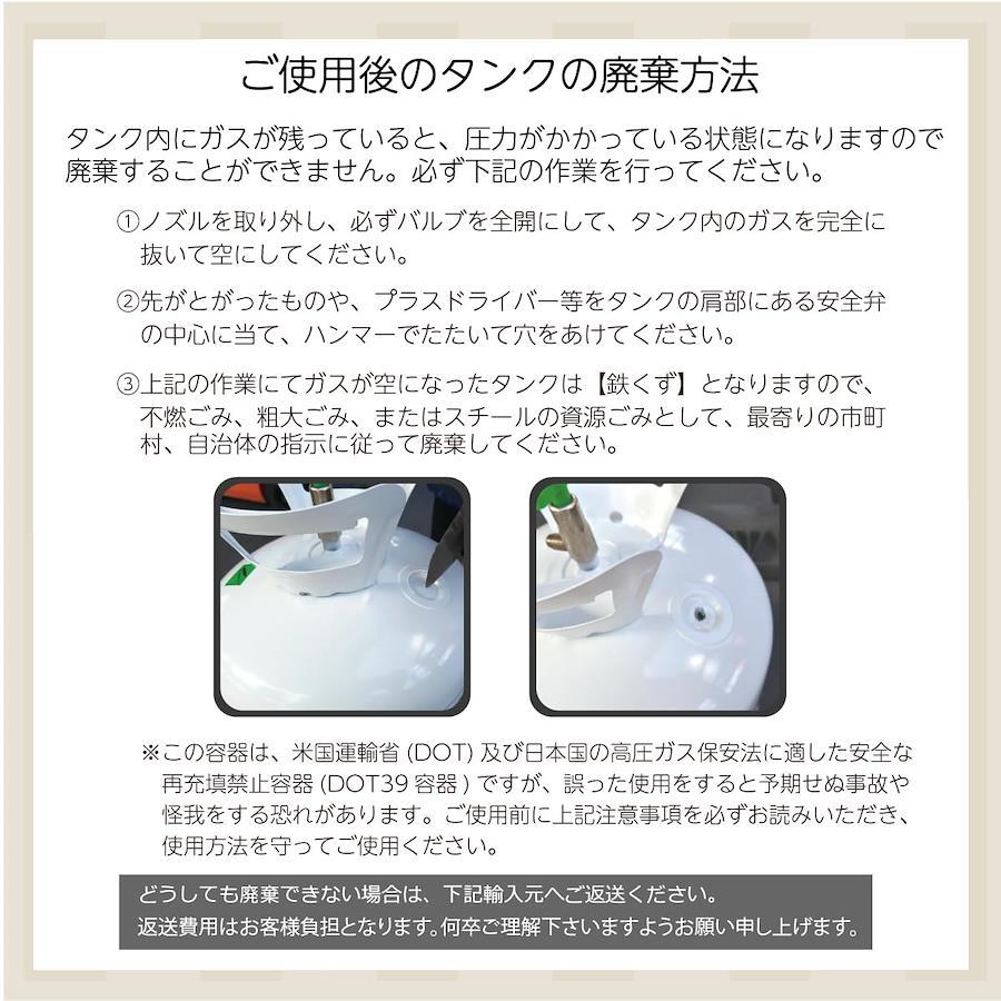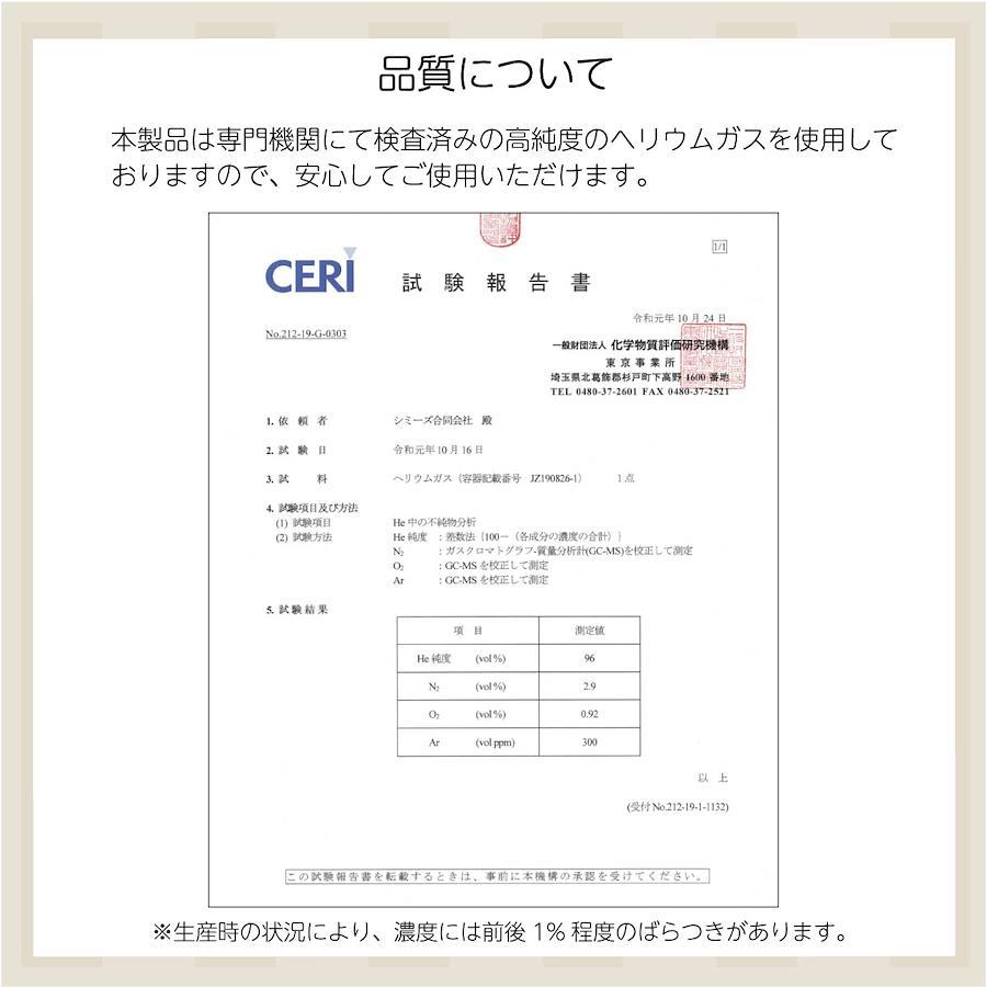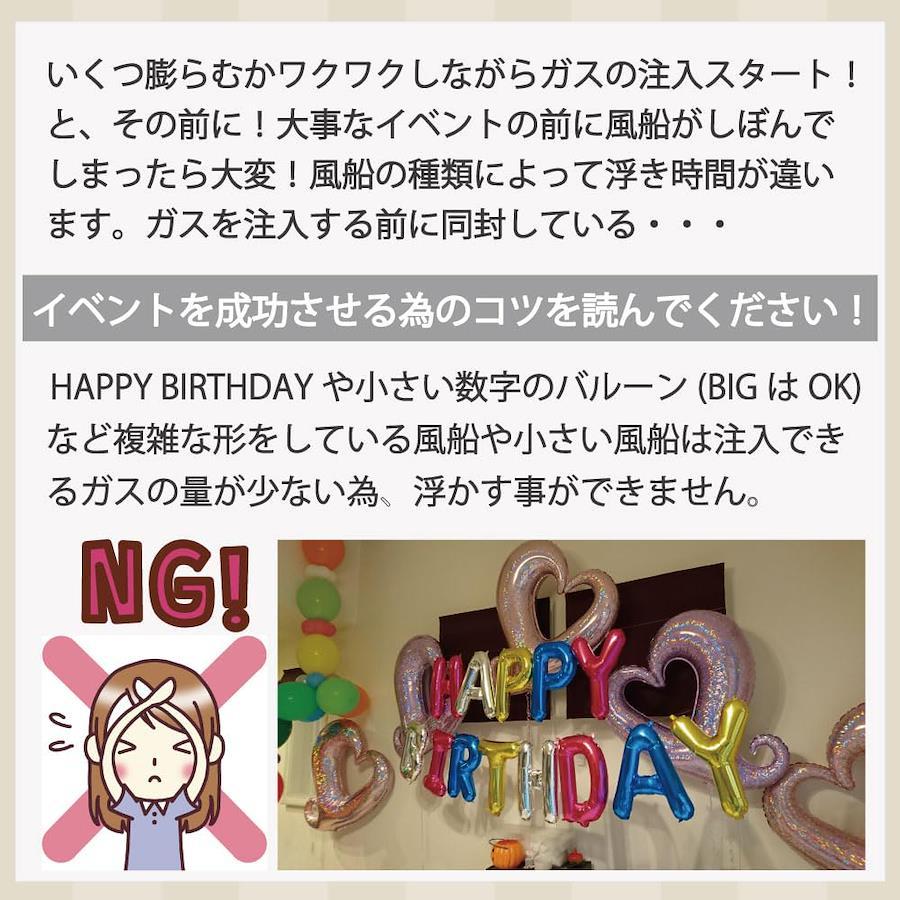 ー注意事項ー ●ゴム風船での注意 ・ゴム風船の平均浮遊時間は約5時間~10時間なので、イベント前日に膨らませていると萎んでしまう可能性があります。必ずイベントの当日に封入するようにしてください。 ・バルーン装飾がはじめての場合、当日予想以上に時間がかかることを想定し、事前に一度試しに膨らませてみることをお勧めいたします。 ●文字風船での注意 ・文字風船などの風船の内容積が小さい風船はヘリウムガスを多く封入できないため、浮かすことができません。 ●その他注意事項 ・ヘリウムガスは無害ですが、吸い込むと酸欠になることがあります。絶対に吸い込まないでください。 ・この製品は使い切り用です。ガスやその他のものを充填することは絶対にしないでください。 ・ガスを一度に使いきらない場合は、元栓(緑色)をしっかり締めてください。元栓を開けたままにしておくと徐々にガスが抜けてしまいます。 ・ヘリウムガスは不燃性ですが、本製品を自動車の車内や、火気使用場所など高温(40℃以上)になる場所には絶対に置かないでください。破裂する危険があります。 ・本製品にサビがでている場合はご使用しないでください。 ・直射日光の当たる場所に置かないでください。破裂する危険があります。 ・本製品をを落としたり、転がしたり、投げたりなど、乱暴な扱いはしないでください。破損の原因になります。 ・お子様の手の届くところに絶対に置かないでください。思わぬ事故を起こす可能性があります。