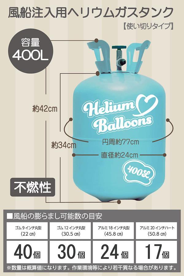 【いろいろなシーンで活躍!】各種イベントで大活躍するヘリウムガス。パーティー、誕生日会、クリスマス、ハロウィン、結婚式、二次会、こどもの日などの各種イベントやちょっとした業務用としてもお使いいただけます。【タンクの大きさ】直径約24cm、高さ34cm(取っ手含む高さ42cm)/ 【内容量】400リットル【ご注意?】この製品は使い切り用です。ガスやその他のものを充填することは絶対にしないでください。【ご注意?】ヘリウムガスは無害ですが、吸い込むと酸欠になることがあります。絶対に吸い込まないでください。【ガスが入っていなかった場合】弊社にて充填後の全量検品を実施しておりますが、極稀にヘリウムが入っていない事例が報告されています。そのため商品到着後、大事なイベント前には必ず事前にガス充填のご確認をお願いいたします。万が一ヘリウムガスが入っていなかった場合は、大至急代替品を発送いたしますので、弊社にご連絡いただきますようお願い申し上げます。【免責事項】メーカーによる商品リニューアルに伴いパッケージ(内容量も含む)変更が行われた場合、新パッケージでお届け致します事ご了承願います。