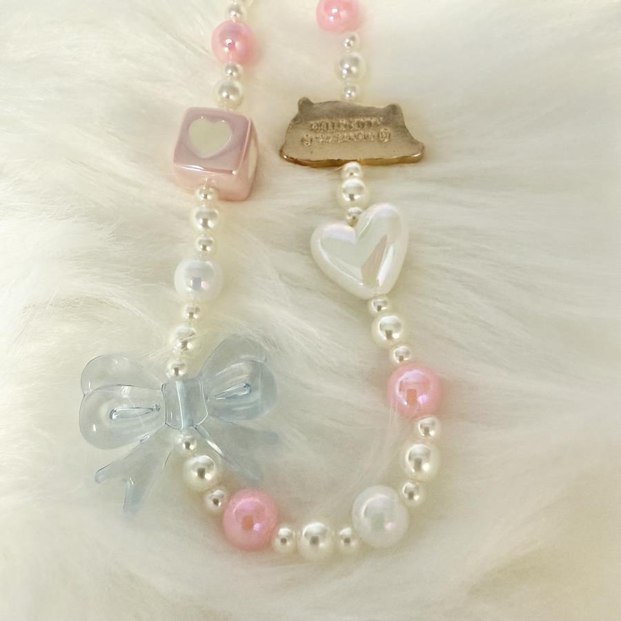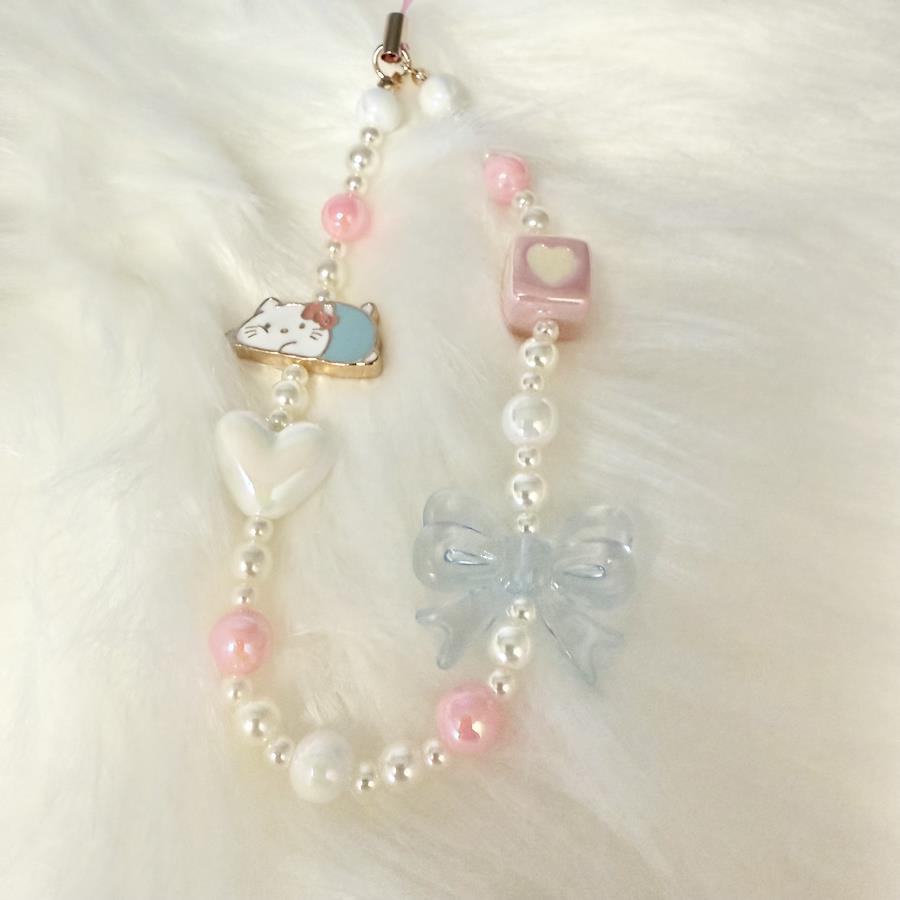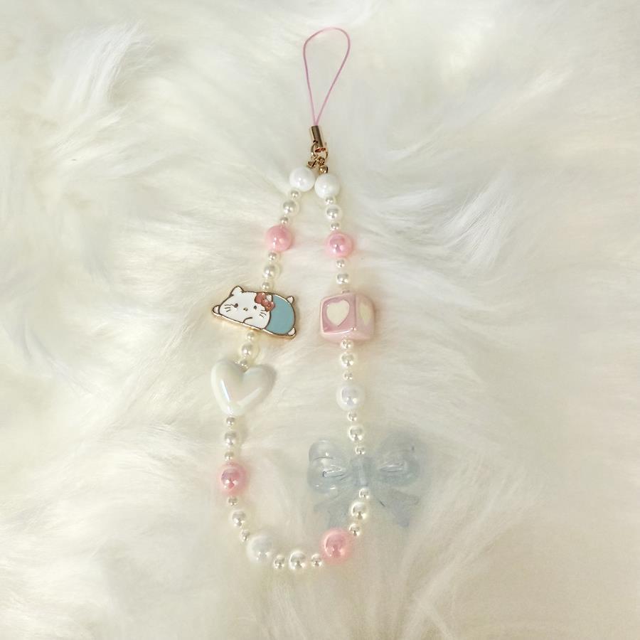 A cute Hello Kitty beaded phone strap featuring pink and white pearls, heart and bow charms, and a sleeping Hello Kitty motif. Perfect for decorating your smartphone, bag, or keychain.Authentic Sanrio item.Condition: Brand New / UnusedApprox. length: 16cm