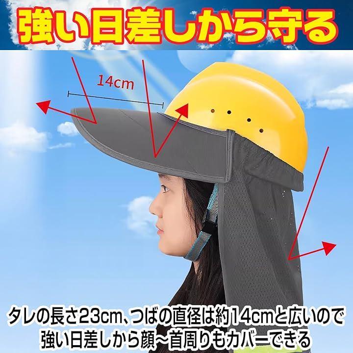 「強い日差しから守る。広範囲カバーの日除けバイザー」つば幅約14cmxタレ約23cmの広範囲設計により、顔だけでなく首元まで日差しから効果的に守ります。