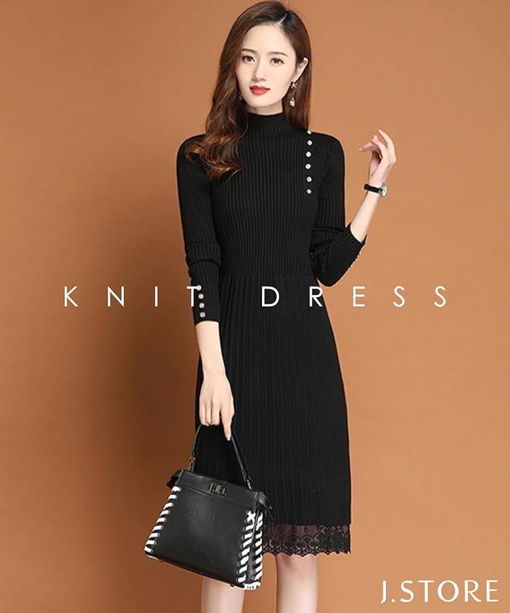 「1枚で着映えするニットワンピ」 フロントと袖口の飾りボタンと裾のレースが印象的な、細見えするように仕上げたミドル丈のニットワンピース。