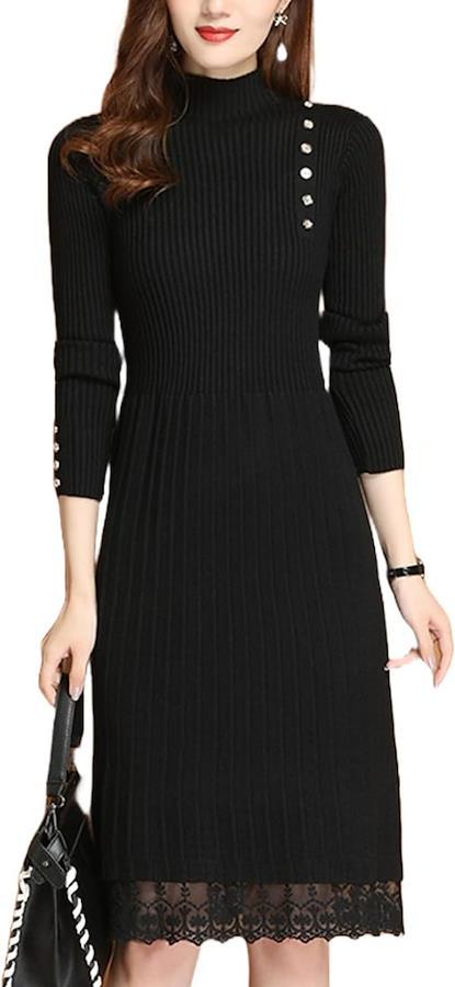 「1枚で着映えするニットワンピ」 フロントと袖口の飾りボタンと裾のレースが印象的な、細見えするように仕上げたミドル丈のニットワンピース。