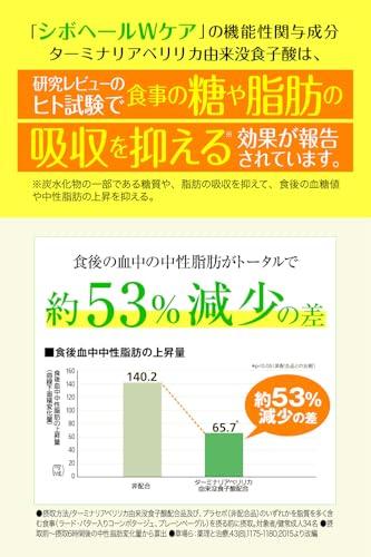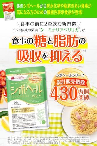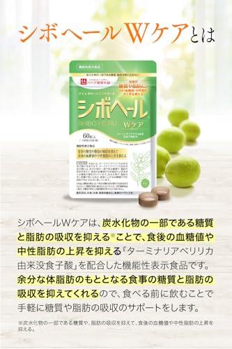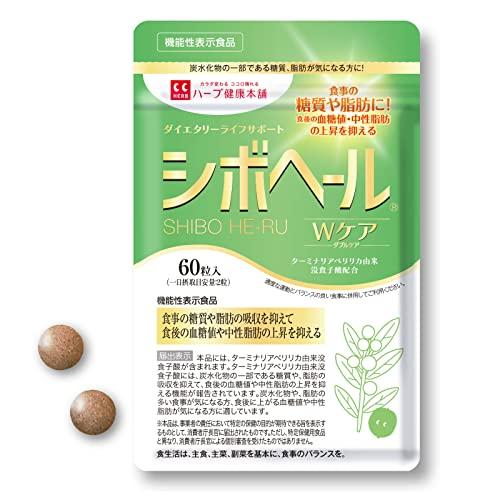 【公式】ハーブ健康本舗以外で販売されている商品はすべて転売品ですのでご注意ください。【公式】ハーブ健康本舗以外の他店でご購入された場合、品質の保証やご質問などにお答えできません。あらかじめご了承ください。※パッケージデザイン等は予告なく変更されることがあります。あらかじめご了承ください。 内容量:13.2g (220mg×60粒) ※1日2粒目安にお召し上がりください。 「 シボヘール Wケア 」は、炭水化物 の一部である 糖質 と 脂肪 の 吸収を抑える ことで、食後の 血糖値 や 中性脂肪 の上昇を抑える「 ターミナリアべリリカ 由来没食子酸 」を配合した 機能性表示食品 です。 余分な 体脂肪 のもととなる食事の 糖質 と 脂肪 の 吸収を抑えてくれる ので、食べる前に飲むことで手軽に 糖質 や 脂肪 の吸収をケアします。 お召し上がり方:「 シボヘール Wケア 」は1日2粒を目安に、水またはぬるま湯でお召し上がりください。 【届出番号】D312、届出表示:本品には、 ターミナリアべリリカ 由来没食子酸が含まれます。ターミナリアベリリカ 由来没食子酸には、 炭水化物 の一部である 糖質 や、 脂肪 の吸収を抑えて、食後の血糖値 や 中性脂肪 の上昇を抑える機能が報告されています。炭水化物 や、脂肪 の多い食事が気になる方、食後に上がる 血糖値 や 中性脂肪 が気になる方に適しています。 ※本品は、事業者の責任において特定の保健の目的が期待できる旨を表示するものとして、消費者庁長官に届出されたものです。ただし、特定保健用食品と異なり、消費者庁長官による個別審査を受けたものではありません。 食生活は、主食、主菜、副菜を基本に、食事のバランスを。