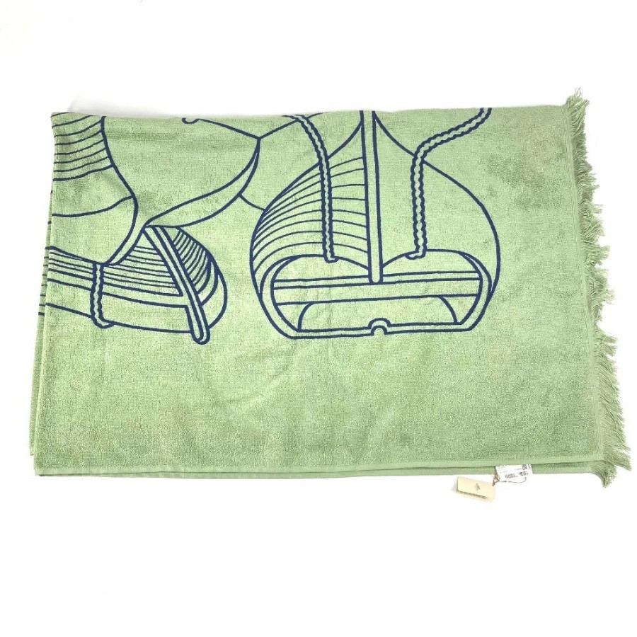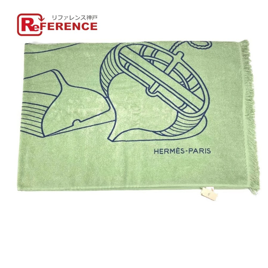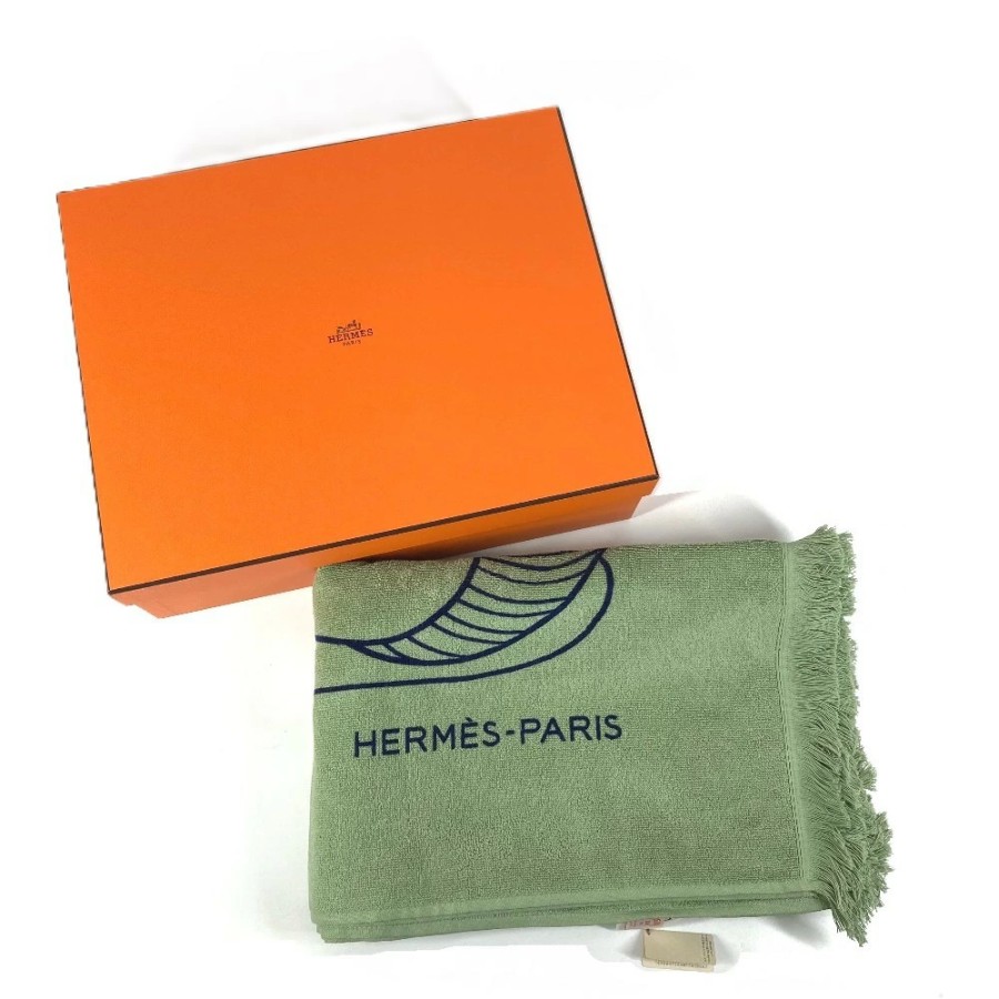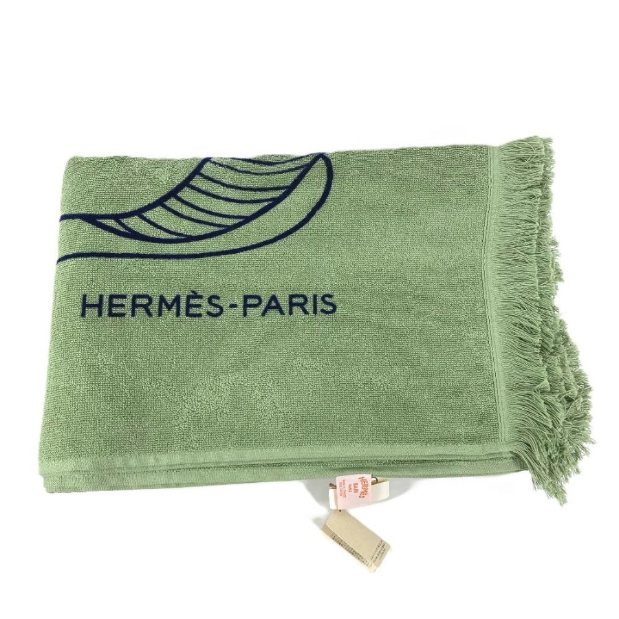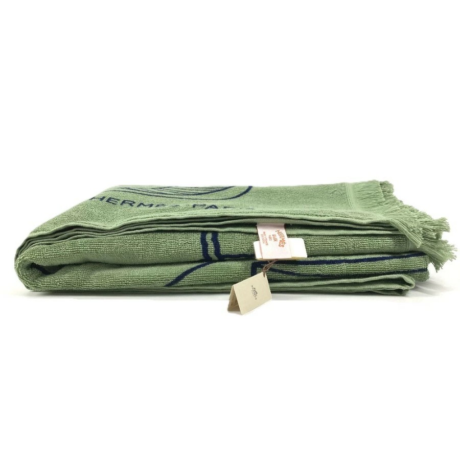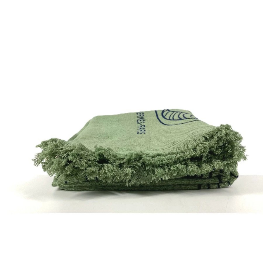 HERMES DRAP DE PLAGE YACHTING THALASSA Bath Towel, Interior Decor, Throw, Blanket, Fringe, Cotton, Unisex, Green, Unused [Pre-owned]