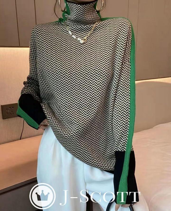 クラシカルな雰囲気のヘリンボーン柄に、肩から袖にかけてのグリーンやオレンジのラインが、都会的で軽快な印象に仕上げてくれます。