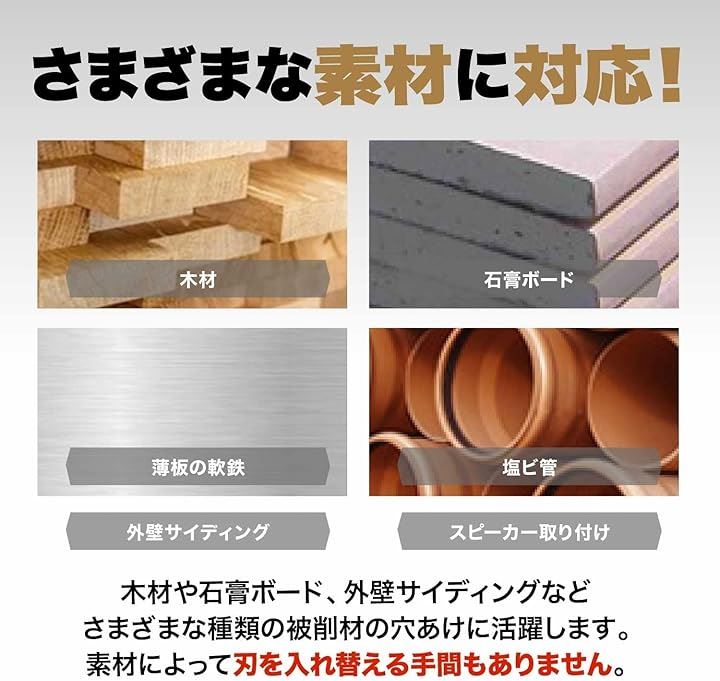 「用途」石膏ボード・プラスチック・木材・合板・薄鉄板・薄ステンレス板・薄アルミ板などの穴あけ作業に使われます。