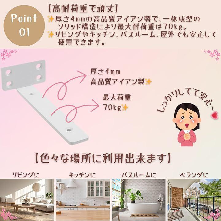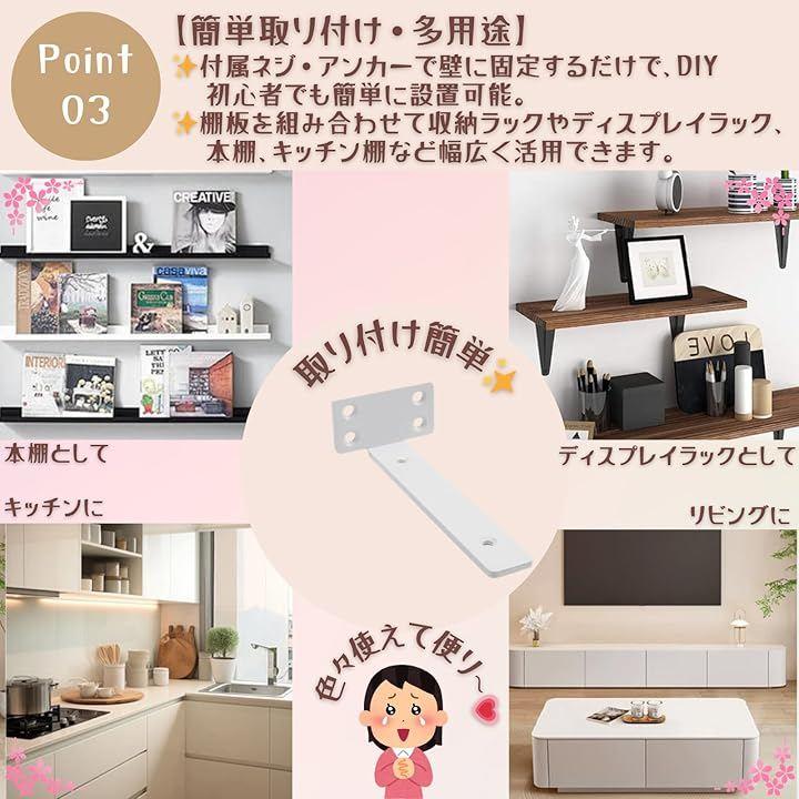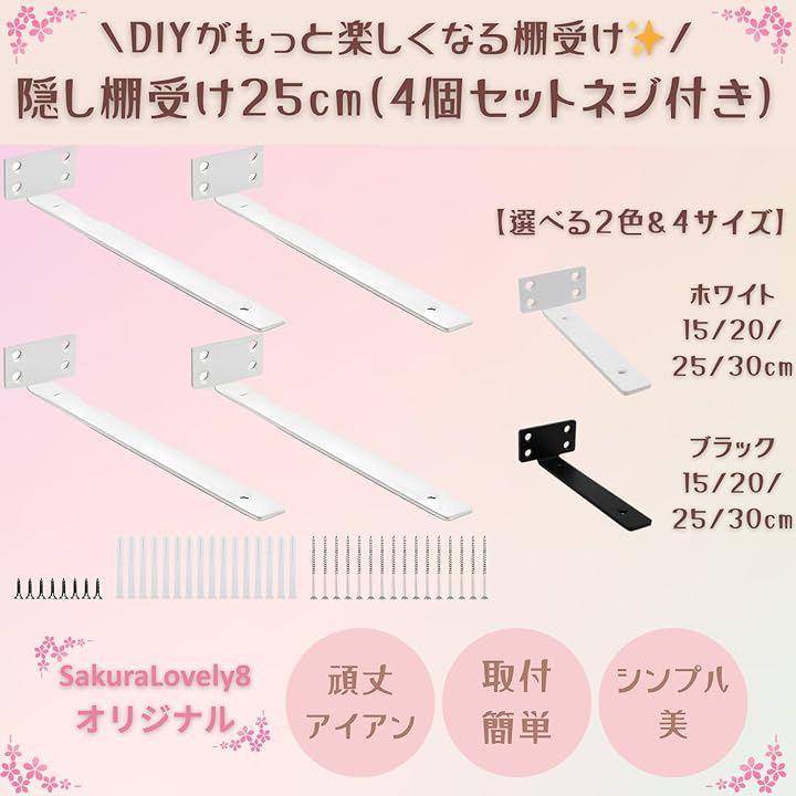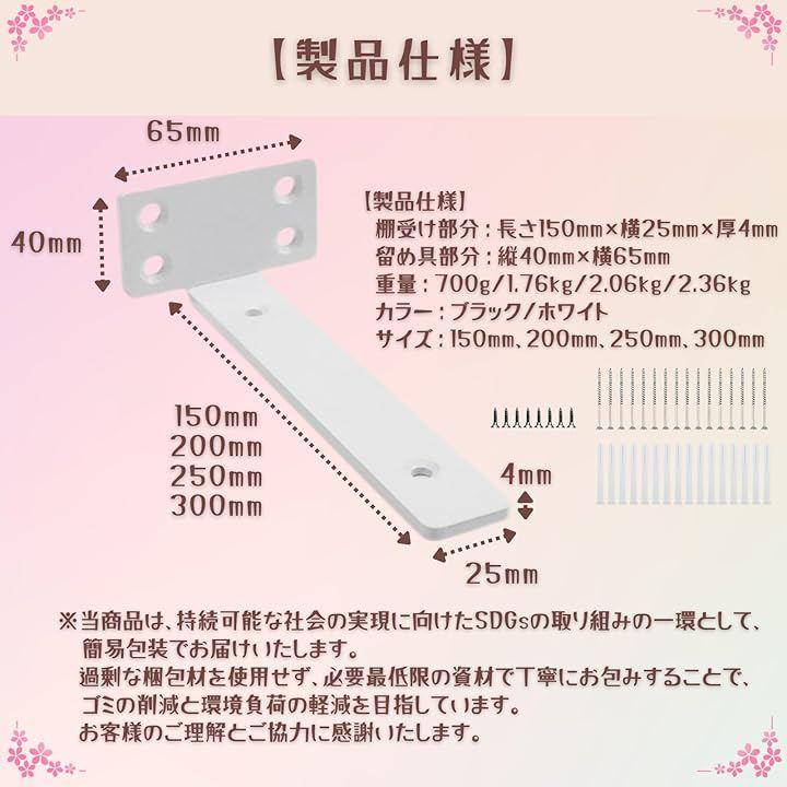 「製品仕様」棚受け部分:長さ150mmx横25mmx厚4mm、留め具部分:縦40mmx横65mm、重量700g、カラー:ブラック/ホワイト、サイズ:150mm、200mm、250mm、300mm *当商品は、持続可能な社会の実現に向けたSDGsの取り組みの一環として、簡易包装でお届けいたします。