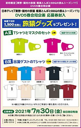 配信限定「極楽とんぼとBBQの旅」のDVDが待望の発売決定!★配信されなかった未公開映像を追加収録したディレクターズカットバージョン!極楽とんぼと一緒に思い出の地巡り相撲やBBQなど笑いといざこざ満載の旅旧知の仲である極楽とんぼの加藤浩次と山本圭壱が旅猿初出演!今回の旅は、極楽とんぼの2人がよくネタ合わせをしていた場所や稽古場など、極楽とんぼ思い出の地を巡る。若手時代のエピソードや、過去に共演していた人気番組の裏話も披露!そして、加藤のリクエストにより4人での相撲対決が開催!さらにラストは、極楽とんぼが住み込みで働いていたというペンションでBBQに挑戦!いざこざやハプニング連続の旅猿一行。果たして無事にゴールできるのでしょうか! ?【未公開!30分を超えるディレクターズカットver.】(1)未公開!加藤 狂犬時代(2)未公開!貴重!東野・岡村の前説時代(3)未公開!旅猿相撲の大一番【未公開!スペシャル特典映像】まだまだあった!山本 必死の乗車!【出演】東野幸治岡村隆史加藤浩次(極楽とんぼ)山本圭壱(極楽とんぼ)[収録分数] 本編106分+特典映像4分★初回限定【東野・岡村の旅猿 極楽とんぼとBBQの旅&シーズン17 DVD5巻合同企画】★≪応募券封入≫抽選で合計1,500名様に『旅猿グッズ』をプレゼント!!A賞及びB賞の中からいずれかご希望の1種を選択いただけます。【A賞】Tシャツとマスクのセット 抽選で計500名様(01東野幸治 Tシャツ+マスク、02岡村隆史Tシャツ+マスク)の2種【B賞】出演ゲストのTシャツ 抽選で各100名様、計1,000名様(04出川哲朗、07ベッキー、10奥貫薫、26鈴木拓、32加藤浩次、33山本圭壱、34原西孝幸、 40劇団ひとり、41ヒロシ、42徳井義実)の10種※ご応募締め切り:2021年7月30日(金)当日消印有効※応募に関する詳細は本商品に封入されます応募券をご覧ください。※初回プレス盤が終了次第、応募券は封入されません。