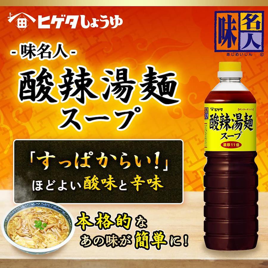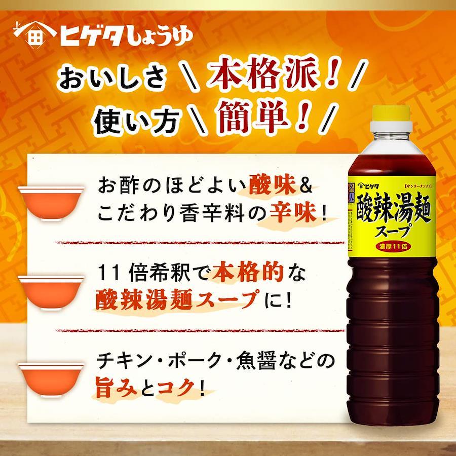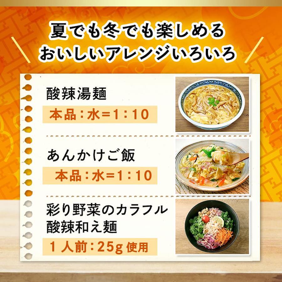 ほどよい酸味と胡椒・唐辛子の辛味がピリッと効いた“すっぱからい"味が特徴の「酸辣湯麺」用スープです。ヒゲタ本醸造しょうゆをベースに、チキンとポークの旨味をきかせた本格的なスープです。酸味と辛みのバランスの良い味です。「酸辣湯麺」は夏でも冬でもおいしく食べられるメニューです。