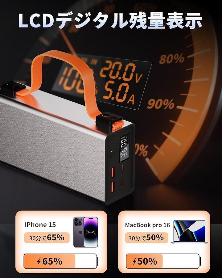 強力な単ポート140W PD出力と二つポート最高200W出力により、30分でiPhone 15を65%充電し、35分でMacBook Pro 15''を50%急速充電することができます。