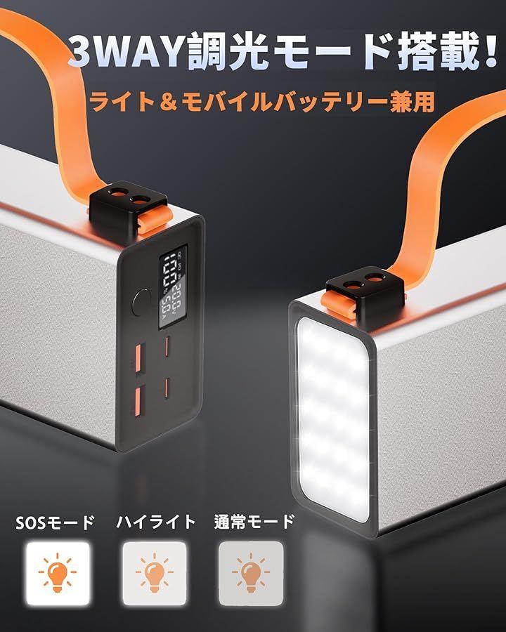 「LEDライトつき 緊急時懐中電灯として」ポータブル充電器にはLEDライトが付いており、各种の環境を照らすことが目的で、4つのモード(強光、中光、弱光、SOSモード)が備わっています。