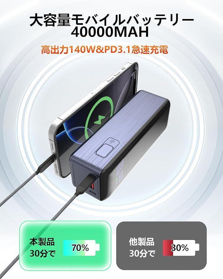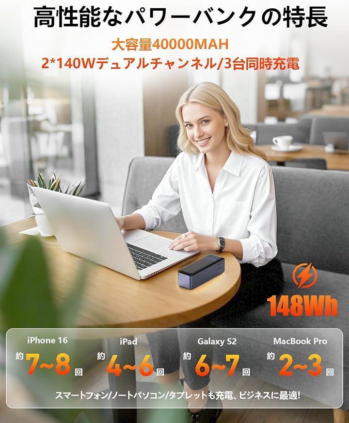 「詐欺なしの大容量 40000mAh (148Wh) 」容量詐欺が常態化しているモバイルバッテリーには珍しく、正直に容量を表示しています。