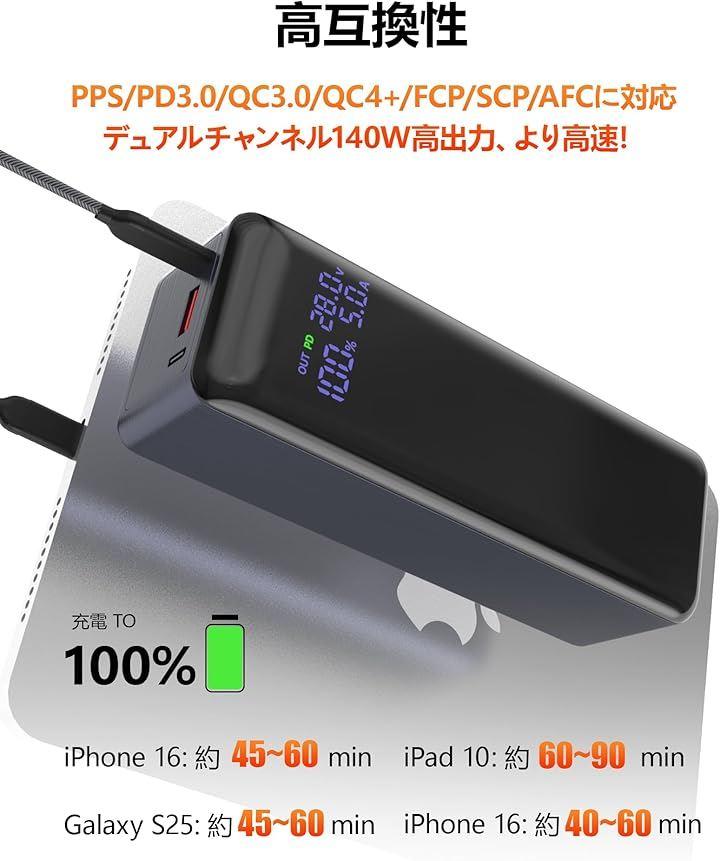 「 デュアルチャンネル、PD3.1単ポート140W高出力、最大合計302.5W」Type-cポート(USB Power Delivery 3.1)が2つ備えて、最大140Wの超高出力でスマホやタブレットはもちろん急速充電できますが、ノートパソコン用モバイルバッテリーとして、MacBook Pro16インチのような高性能ノートPCも僅か30分で50%充電できます。