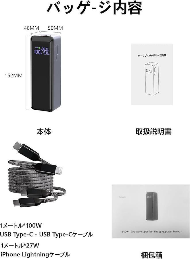 「セット内容」モバイルバッテリー本体、27W ケーブル、100W USB Type-Cケーブル、日本語取扱説明書。