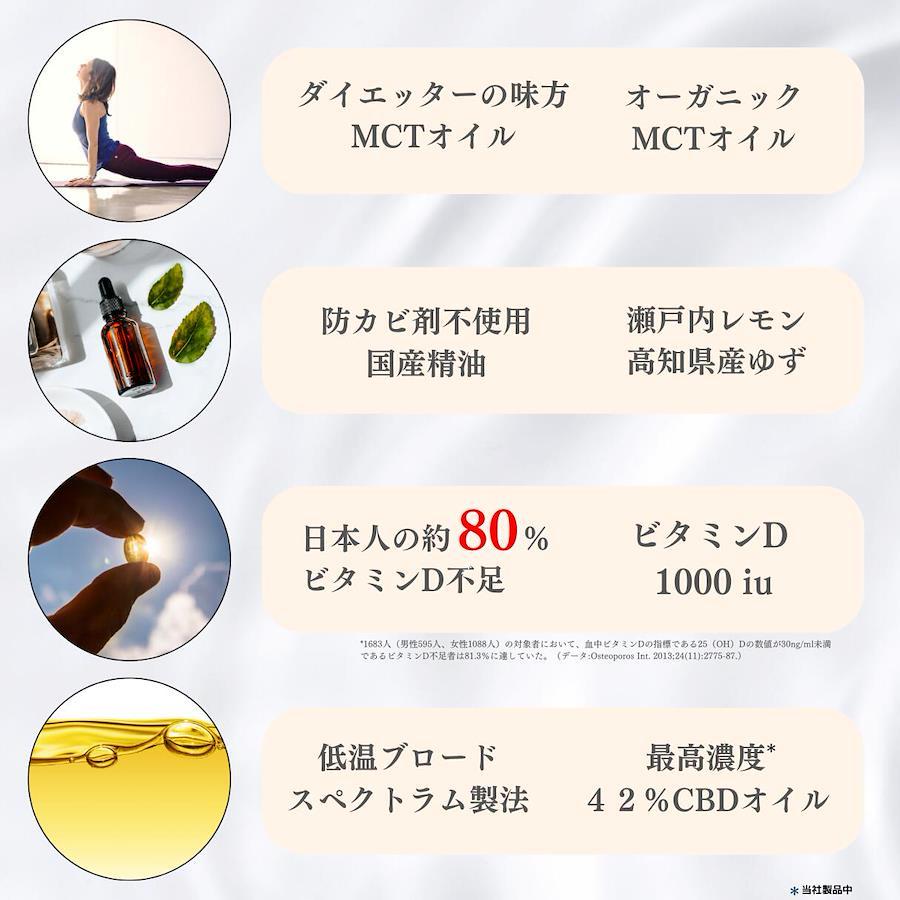 ■原材料名/オーガニックMCTオイル カンナビジオール 瀬戸内産レモン精油 高知県産ゆず精油 植物性テルペン ビタミンD ビタミンC
