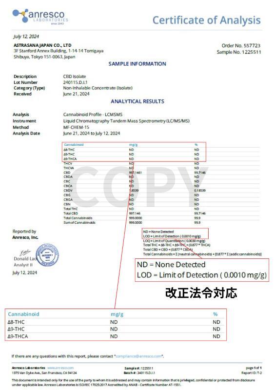・本商品に使用されているCBDは輸入時に厚労省に求められた書類提出し,税関での検査を受け,食品原料として通関しております。