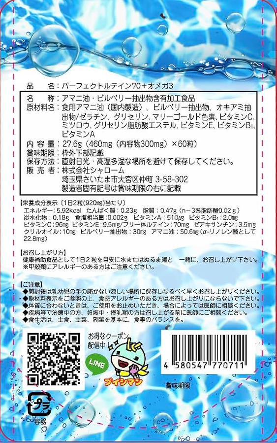 原材料:食用アマニ油 (国内製造)、ビルベリー抽出物、オキアミ抽 出物/ゼラチン、グリセリン、マリーゴールド色素、ビタミンC、 ミツロウ、グリセリン脂肪酸エステル、ビタミンE、ビタミンB1、 ビタミンA