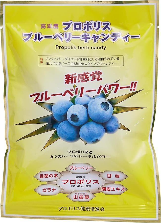 原材料:還元パラチノース(ドイツ製造)、プロポリスエキス、ブルーベリー濃縮果 汁、メグスリノキエキス、甘草エキス、ガラナエキス、陳皮エキス、サンシュユの実エキス、菊花エキス、クコシエキス、ブルーベリーエキス/酸味料、香料、甘味料(アセスルファムK、スクラロース)