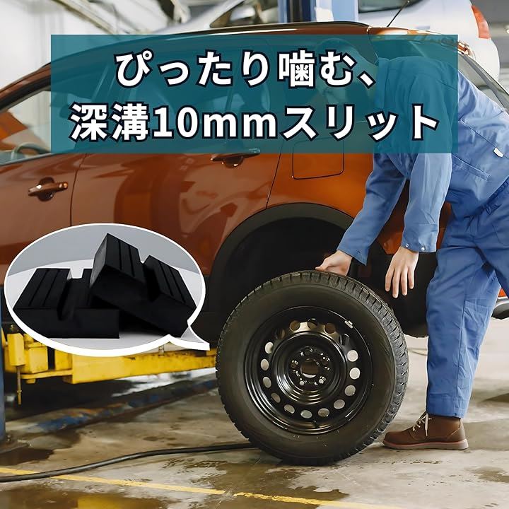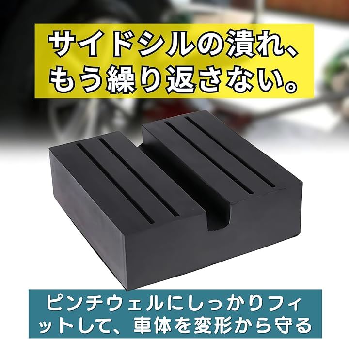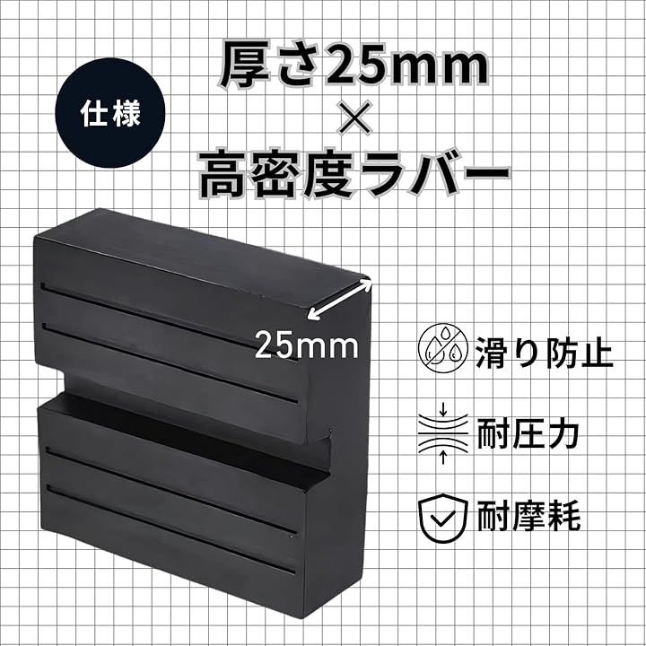 しっかり支えるプロ仕様」 高密度ゴム製の構造により、耐荷重性はもちろん、金属製ジャッキとの摩擦で滑ることを防ぐ防滑性能も強化。