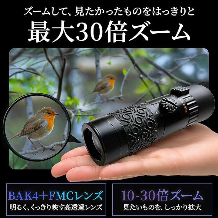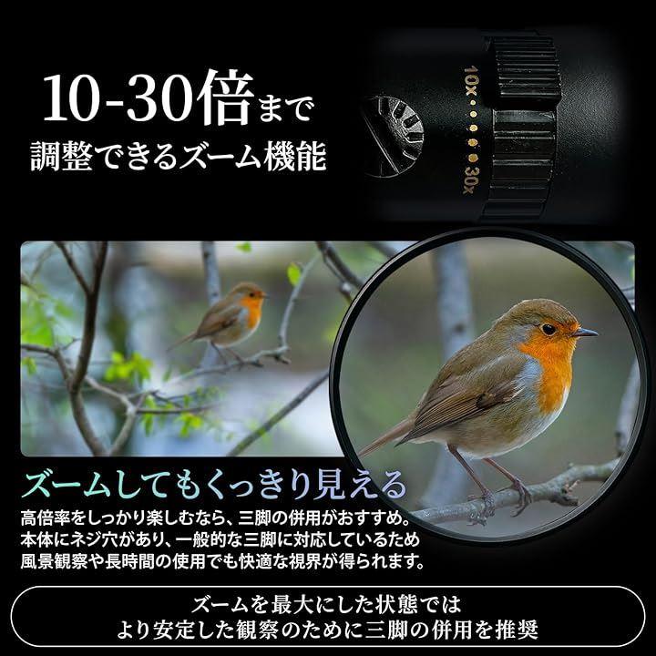「10-30倍ズーム&高性能レンズ搭載」調整可能な10~30倍ズームとBAK4ポロプリズム、FMCマルチコーティングレンズを採用。