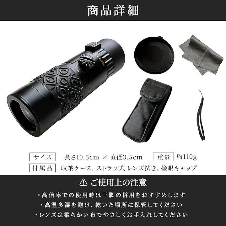 「商品詳細」 ・サイズ:長さ10.5cmx直径3.5cm ・倍率:最大30倍 ・重量:約110g ・付属品:収納ケース,ストラップ,レンズ拭き,接眼キャップ,取扱説明書