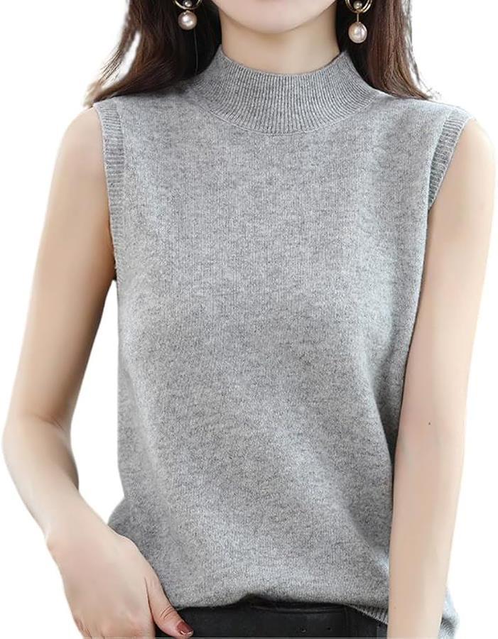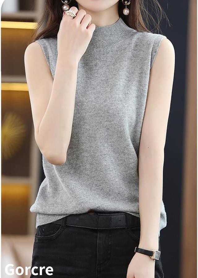 ハイネックノースリーブに、襟と袖がリブ仕様になって、フェミニンな大人の女性を演出。