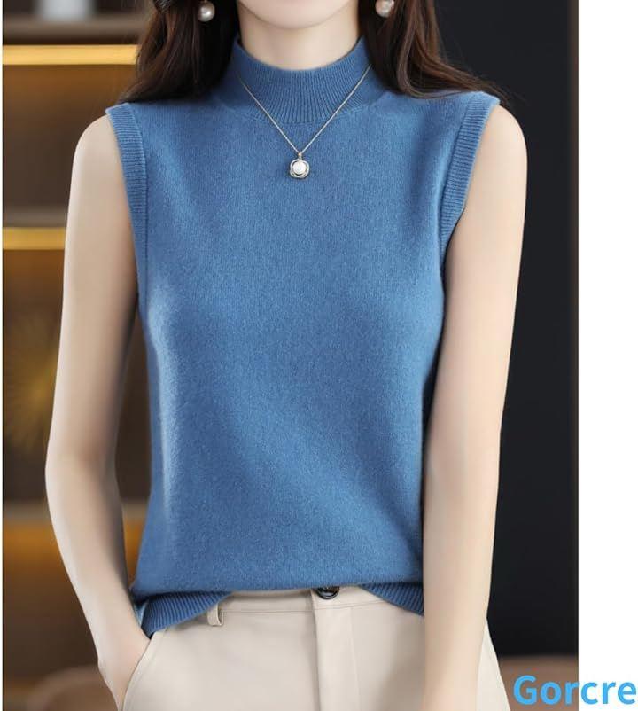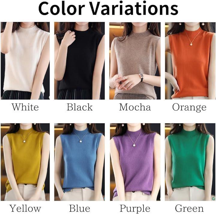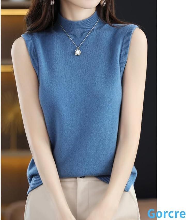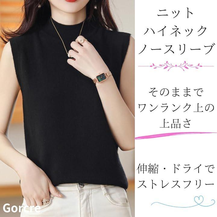 ハイネックノースリーブに、襟と袖がリブ仕様になって、フェミニンな大人の女性を演出。