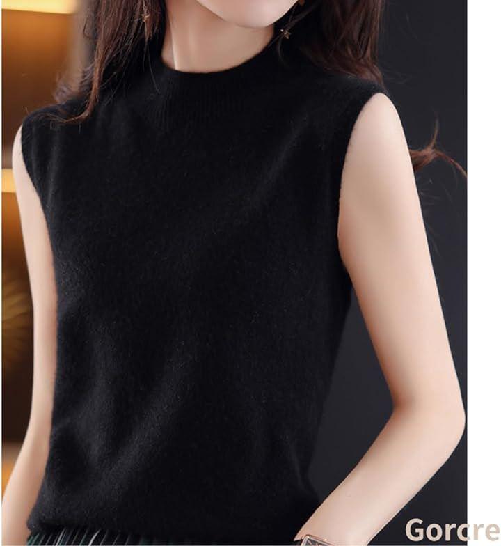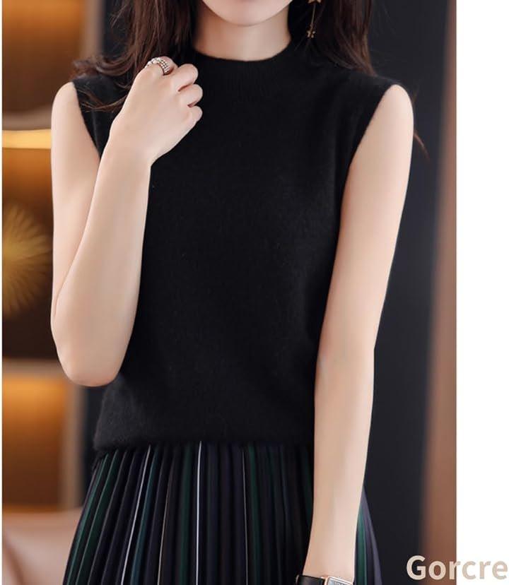 ハイネックノースリーブに、襟と袖がリブ仕様になって、フェミニンな大人の女性を演出。