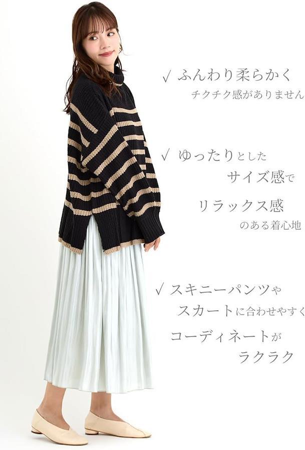 ボーダーパターンが施されたこのハイネックリブニットは、季節を問わず着用でき、ジーンズやレギンスとの相性が抜群です。