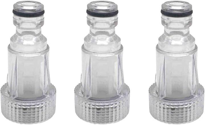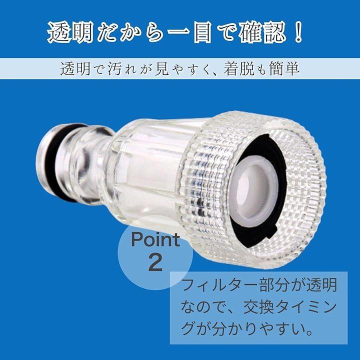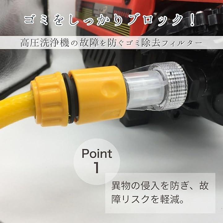 「高圧洗浄機の故障を防ぐゴミ除去フィルター」給水口に簡単に取り付け可能で、水道水や井戸水、雨水などの金属片やゴミの混入を防ぐ。