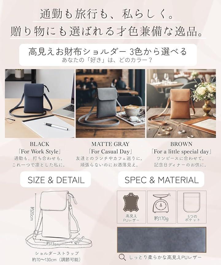 「商品仕様」素材:ソフトレザー(マット調合成皮革)カラー:ブラック/グレー/ブラウン サイズ:約 縦20cm x 横13cm x マチ3cm(コンパクト設計)重量:約170g ストラップ:長さ 約70~130cm/幅 約1.3cm(調整可)開閉方式:フラップ(マグネットスナップ式)ポケット構成:合計5ポケット(メイン収納x2/内ポケットx1/外側ファスナーポケットx1/背面縦型ポケットx1)