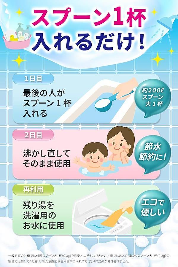 入浴後にスプーン1杯を入れるだけで、翌日も清潔な風呂水をキープ。