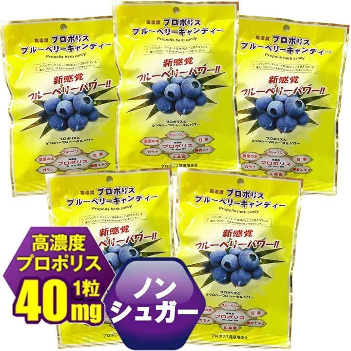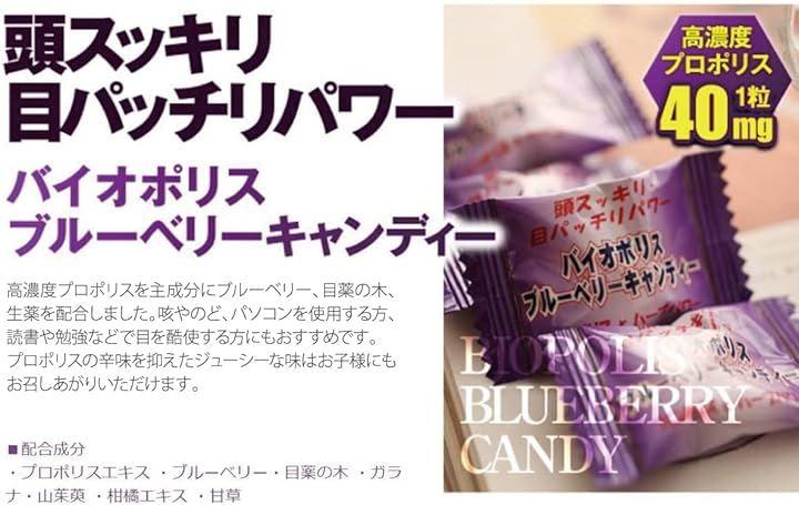 [ブルーベリーキャンディー成分]プロポリスエキス・ブルーベリーエキス・ブルーベリー果汁・目薬の木・ガラナ・山茱萸・柑橘エキス・甘草・キクカエキス・クコエキス・還元パラチノース・香料・甘味料・クエン酸
