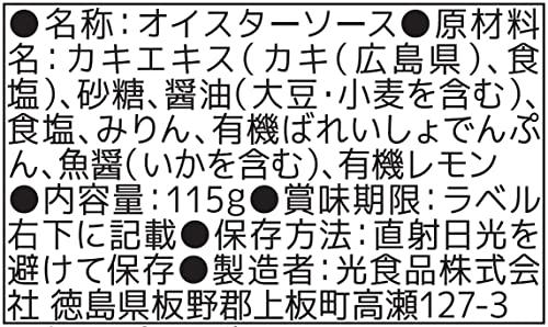 光食品 オイスターソース 115gは、 ■瀬戸内海産の新鮮なカキを、自己消化酵素で分解したエキスがベース ■いかと食塩だけで1年間じっくりと熟成発酵させた魚醤使用 ■化学調味料不使用