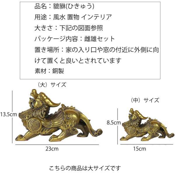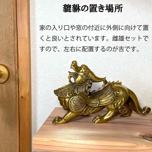 貔貅(ヒキュウ)は、漢の時代以前には翼獣と呼ばれた中国古代神話上の生物です。元々は避邪獣と言われ、魔除けの効果があったのですが、風水的には、どんな願い事も叶えてくれるという有難い特性を与えられています。財を集める効果に優れ、特に賭け事やギャンブルなどによるお金(偏財)には効果があると言われています。室内に置き、頭を玄関へ向けると、四方八方の財を家に招くと言われています。風水を研究していくと最後には貔貅にたどり着くと言われている風水最高のアイテムの一つです。可愛がれば可愛がるほど効果を発揮すると言われており、中国では毎日清めの水を供えたり、香を焚いたりして大事にしています。貔貅は【眠たがり】という、ちょとおもしろい設定がされています。