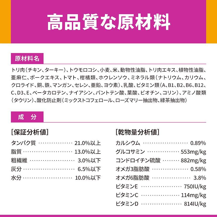 愛犬が元気で健やかな毎日を送るため、ヒルズ独自の抗酸化ブレンドで本来の免疫力を維持しながら健康をサポートする、最適な栄養バランスのドッグフードです。1~6歳までのトイプードル、チワワやミニチュアダックスフンドといった小型犬種に対応。消化に良い高品質な自然素材を、小型犬が食べやすい小さな粒に凝縮しました。高品質なたんぱく質を使用し、引き締まった筋肉を維持。また、カルシウムやグルコサミン、コンドロイチン硫酸が健康な骨や関節をサポートするとともに、ビタミンD&Cを配合することで、歯と歯ぐきの健康を維持します。さらに、ビタミンEとオメガ3&6脂肪酸が、健康な皮膚と美しい被毛もサポートします。この製品は、ペットフード公正取引協議会の定める分析試験の結果、成犬用の総合栄養食であることが証明されています。