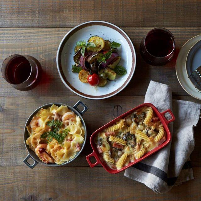 出来たてアツアツの料理をそのまま食卓に出せる耐熱皿。グラタンはもちろん、ドリアやラザニアまで作れるサイズまで揃えました。無駄のないデザインとくすみカラーが上品なシリーズです。