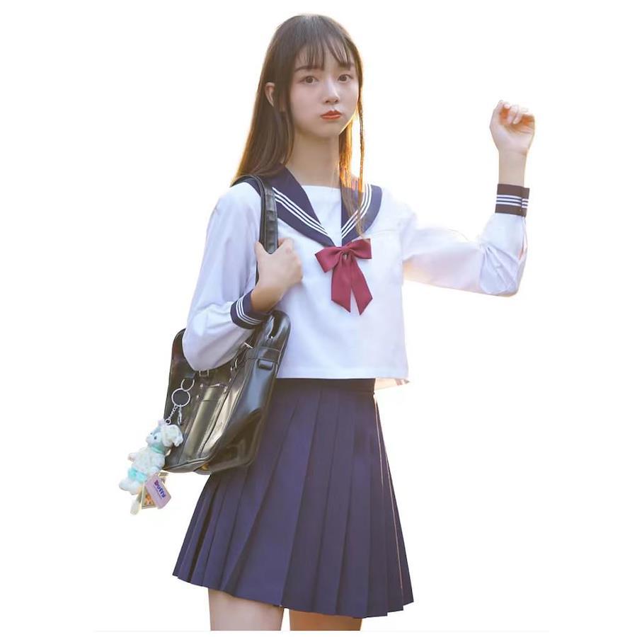 [HINATA] セーラー服 JK制服 コスチューム 女子高校生 コスプレリボンタイ付き トップス プリーツスカート ソックス 4点セット 蝶結び 清純 学園祭 文化祭 仮装 ハロウィン クリスマス フルセット(長袖 L)
