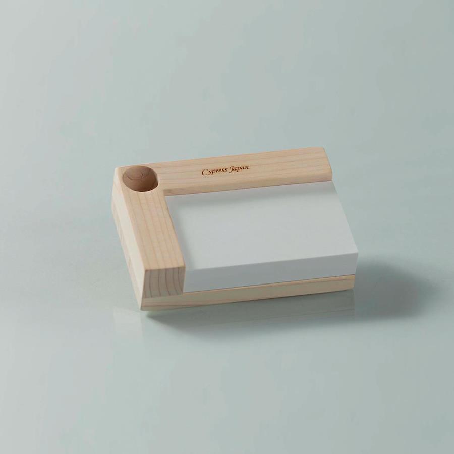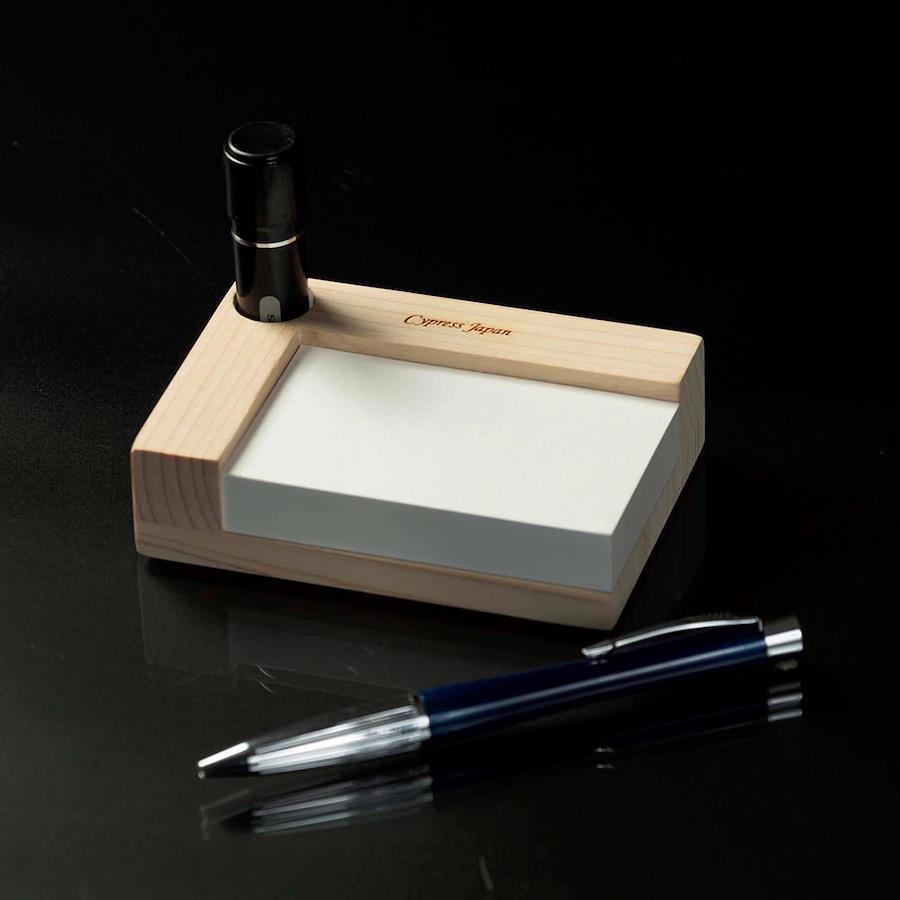 日本産ヒノキ無垢材から作ったデスクメモパッドです。左の穴には印鑑を入れる事ができます。メモのサイズは名刺やカードと同じサイズなので、メモが無くなれば名刺やカード置きとして使う事ができます。