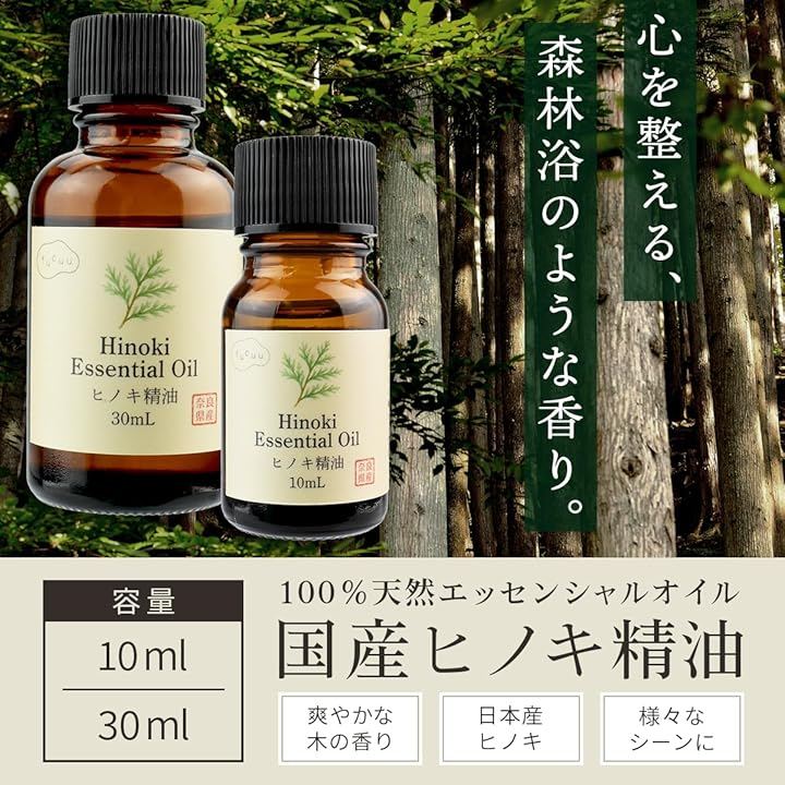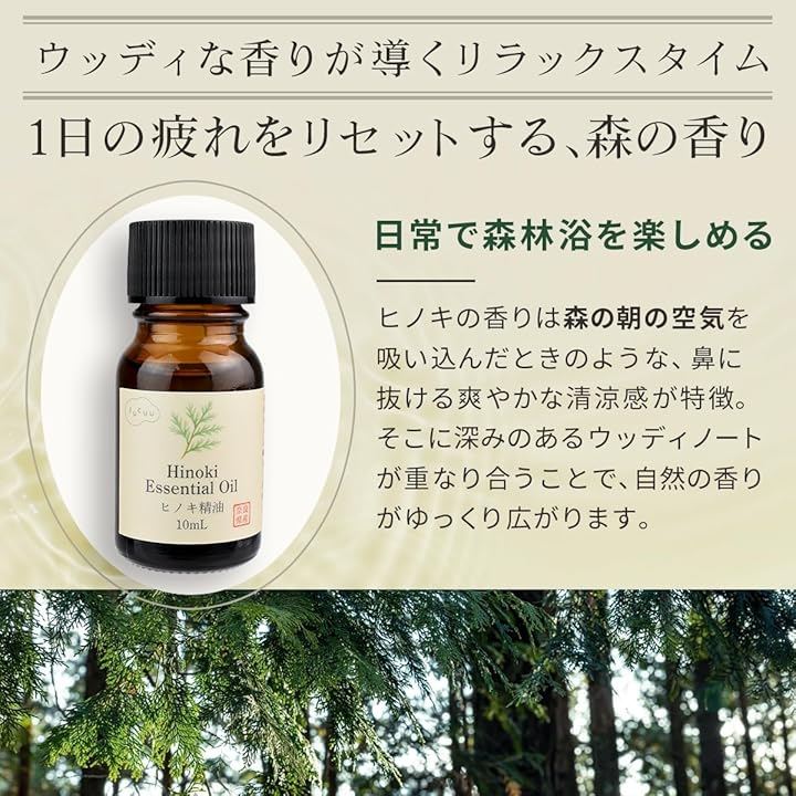 「おすすめの使い方」 ・ディフューザー:6~8滴 ・お風呂:3~5滴(よくかき混ぜてご使用ください) ・ハンカチやティッシュに1~2滴 お風呂に数滴垂らせば、 ふわっと広がるヒノキの香りで一日の疲れをそっとほどきます。