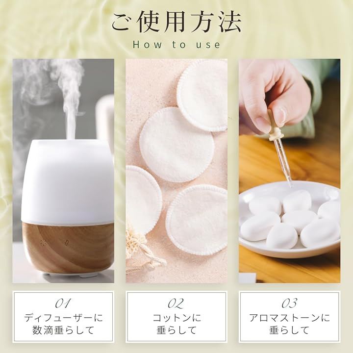 「多用途で楽しめる」使い方はディフューザー・コットン・アロマストーンなどに数滴垂らすだけ。調合や計量不要で手軽に森の香りを楽しめるのがポイントです。