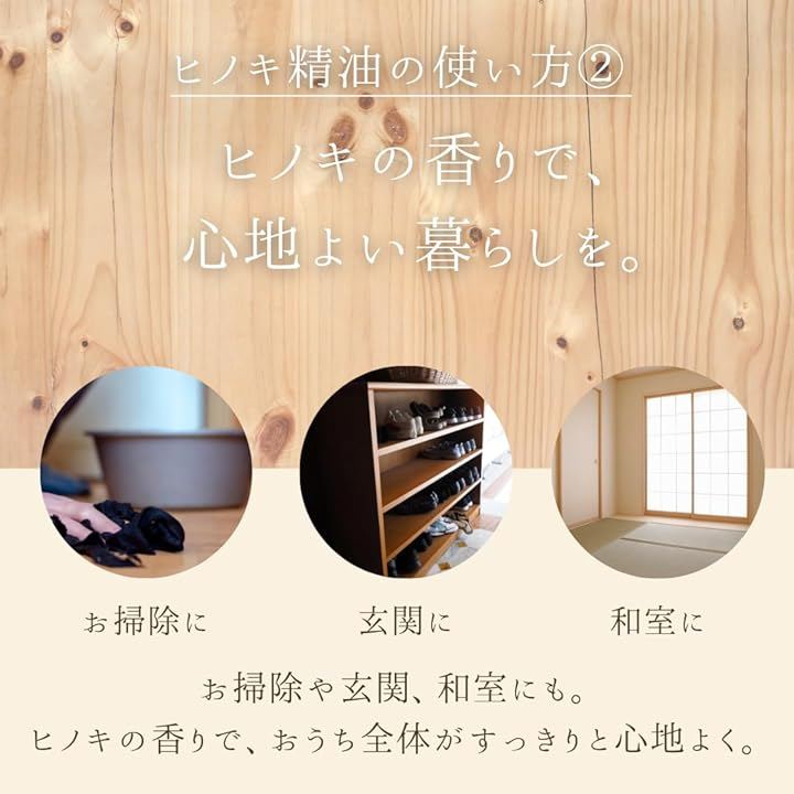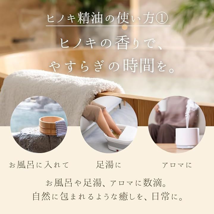 「おすすめの使い方」 ・ディフューザー:6~8滴 ・お風呂:3~5滴(よくかき混ぜてご使用ください) ・ハンカチやティッシュに1~2滴 お風呂に数滴垂らせば、 ふわっと広がるヒノキの香りで一日の疲れをそっとほどきます。