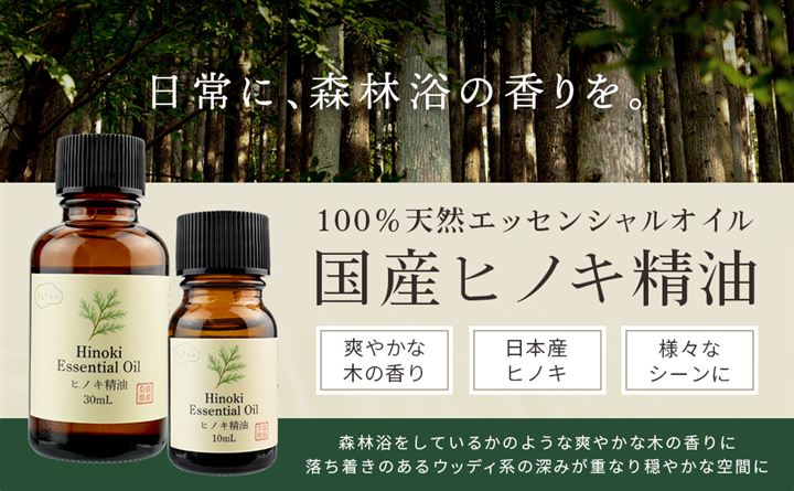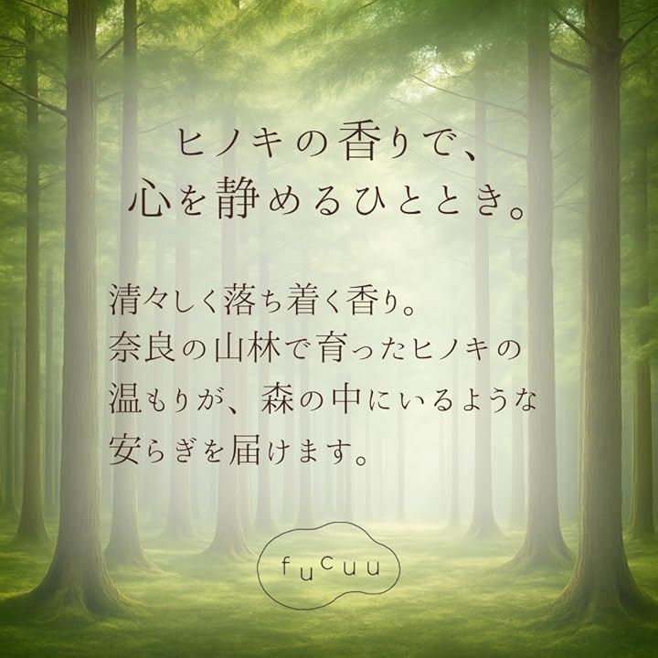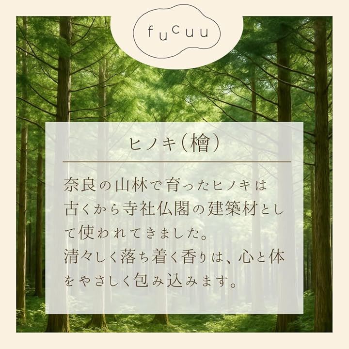 香りの強さ目安:やさしく広がるタイプ 奈良県産ヒノキを100%使用し、 合成香料を加えず、水蒸気蒸留法で丁寧に抽出しました。